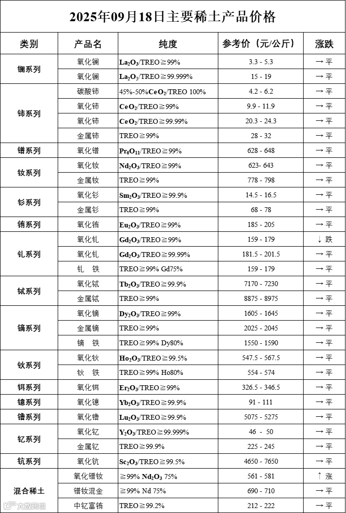 国内稀土市场整体表现欠佳,受下游需求跟进缓慢与市场现货供应相对充足影响,主流稀土产品价格走势有所分化:镨钕系产品价格继续回调,而镝铽系产品价格则企稳运行。
