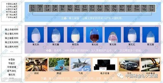 下游:稀土的应用十分广泛,大到坦克、战斗机、钢材冶金、光纤通信等领域,小到消费电子、催化剂、节能灯、汽车、显示器等产品都有稀土的存在。