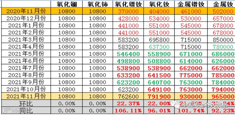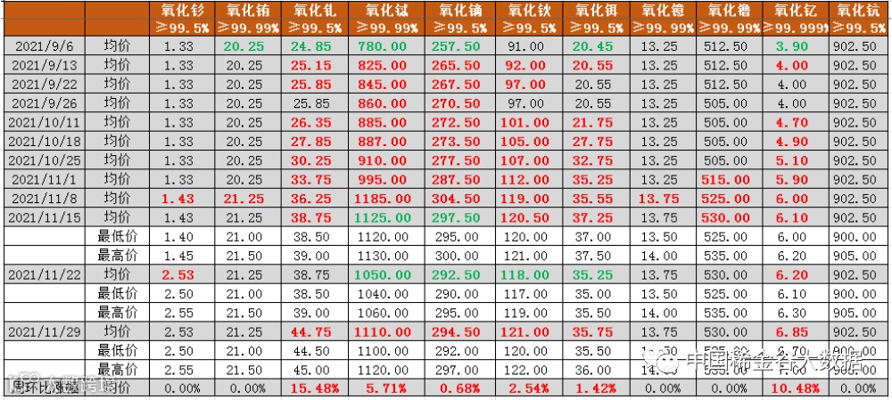 与今年8月份第一次挂牌价格相比:镧、铈氧化物价格不变,镨、钕系金属及氧化物价格大幅上涨,涨幅均超过5%。具体如下: