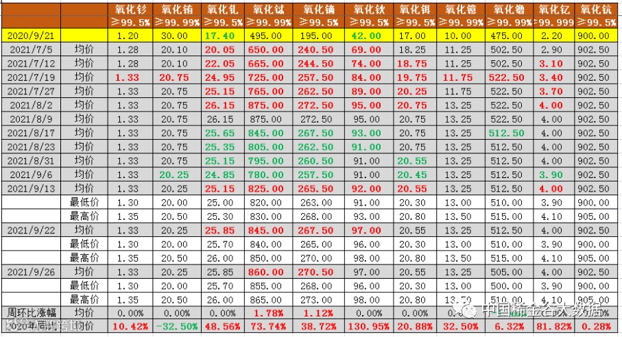 与2020年9月22日挂牌价同比分析,氧化铕同比下降(降幅30.8%→32.5%,降幅与上期相比,不变),其它10种氧化物均同比上涨。