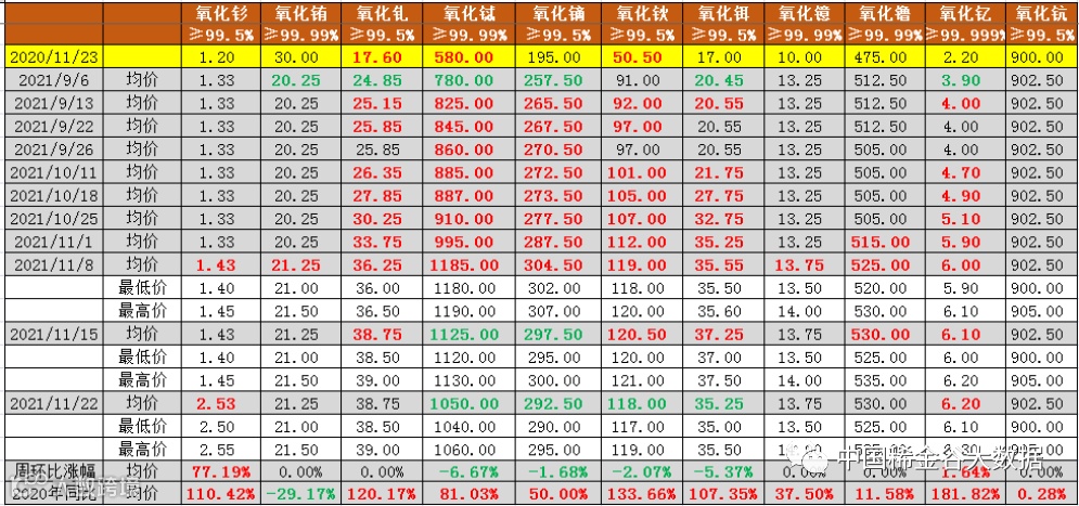 与2020年11月23日挂牌价同比分析,氧化铕同比下降(降幅29.2%→29.2%,降幅与上期相比,不变),其它10种氧化物均同比上涨。