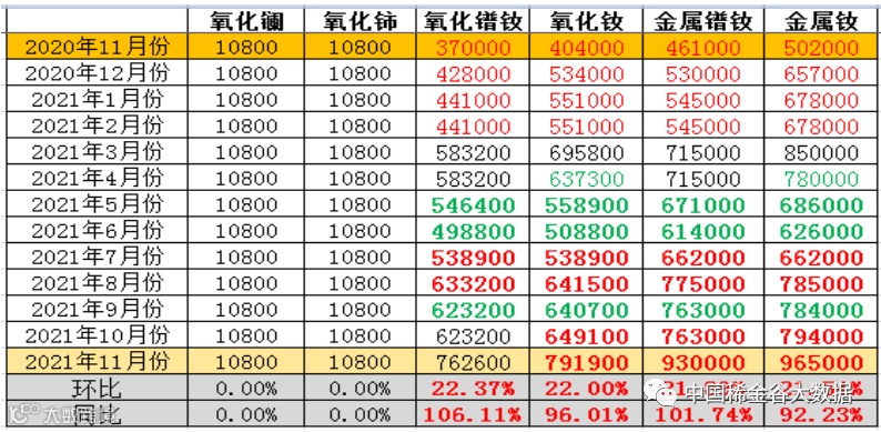 与2020年11月同期相比,氧化镧、氧化铈同比不变;镨钕系金属及其氧化物价格同比大幅上涨,涨幅与上月相比,同比涨幅均超过90%。氧化镨钕、氧化钕、金属镨钕、金属钕同比涨幅变化分别为75%→106%、73%→96%、71%→102%、69%→92%。
