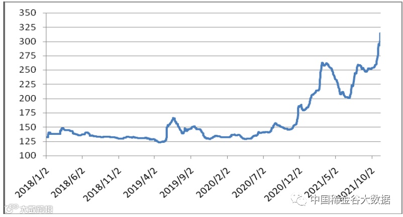 图1 镨钕系轻稀土挂牌价格走势图(201911-202111)