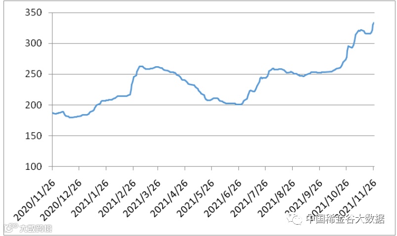 本周有5个交易日,稀土价格指数分别为316.2、317.4、322、330.5、333.2,价格指数本周恢复上涨,20201126-20211126区间稀土价格指数走势图、2018-2021年稀土价格指数同期走势图。