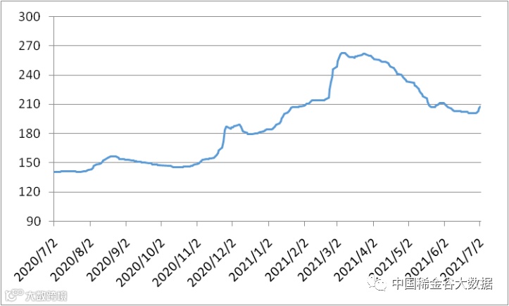 图1 镨钕系轻稀土挂牌价格走势图(201906-202106)