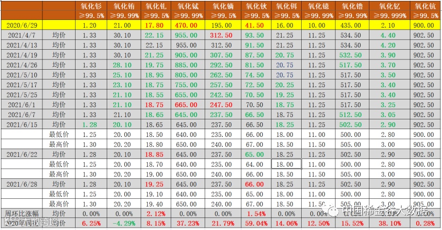 与2020年6月22日挂牌价同比分析,氧化铕同比下降(降幅4.29%,降幅与上期相比,保持不变),其它10种氧化物均同比上涨。