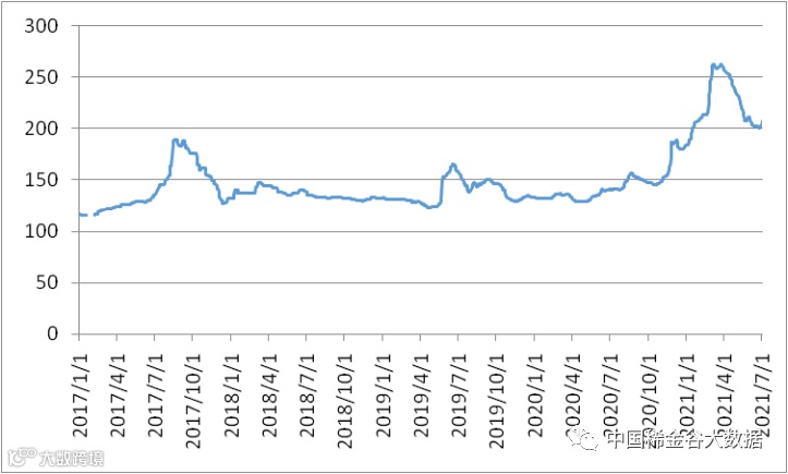本周有5个交易日,稀土价格指数分别为201.1、201.8、203、205.5、207.5,价格指数本周小幅上涨,20200702-20210702区间稀土价格指数走势图、2018-2021年稀土价格指数同期走势图。