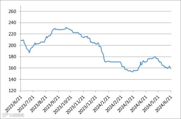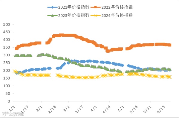 本周有5个交易日,稀土价格指数分别为163.6、162.9、160.1、159.5、159.5,价格指数下降。20230621-20240621区间稀土价格指数走势图、2022-2024年稀土价格指数走势图、2021-2024年价格指数同比走势图如下: