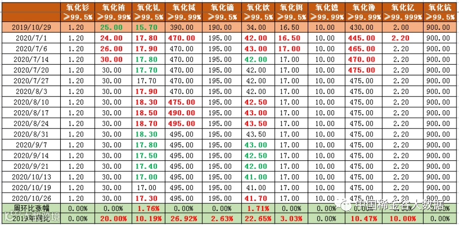 与2019年10月29日挂牌价同比分析:氧化钐、氧化镱、氧化钪价格同比保持不变;其它8种氧化物挂牌价格环比上涨。其中涨幅超过10%的有氧化铕(涨幅20%,涨幅与上次持平)、氧化钆(涨幅10.19%)、氧化铽(26.92%,涨幅比上次扩大)、氧化钬(涨幅22.65%,涨幅比上次扩大)、氧化镥(涨幅10.47%,涨幅与上次持平)、氧化钇(涨幅10.00%,涨幅与上次持平)。