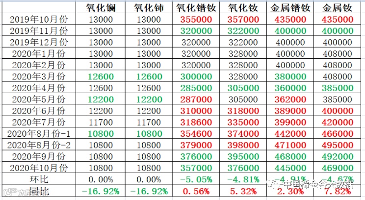 北方稀土市场营销部于10月12日发布2020年10月份轻稀土挂牌价格,具体数据见表2。
