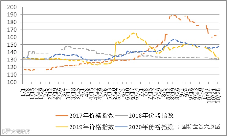 本周有五个交易日,稀土价格指数分别为146.1、146.6、147.1、147.3、147.4,稀土价格指数小幅上扬。稀土价格指数年度走势及近四年同期价格走势见20191030-20201030区间稀土价格指数走势图、2017-2020年稀土价格指数同期走势图。