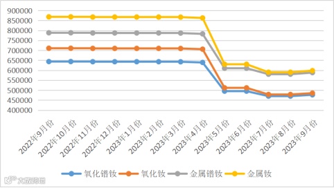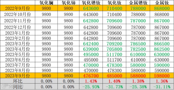 与2022年9月同期相比,氧化镧、氧化铈同比保持不变;镨钕系金属及其氧化物价格同比下降,氧化镨钕、氧化钕、金属镨钕、金属钕同比降幅分别为25.93%、31.73%、25.38%、31.11%。