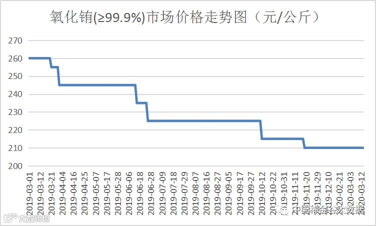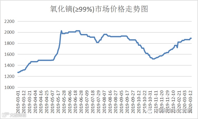 与2019年3月18日挂牌价同比分析:氧化钐、氧化钇、氧化镥、氧化钪同比价格不变;其它氧化物同比价格均有涨跌,其中同比价格涨幅超过15%的有氧化钆(涨19.85%)、氧化铽(涨39.61%)、氧化镝(涨39.13%)、氧化钬(涨20.67%),氧化铕价格同比下降,降幅为27.59%。