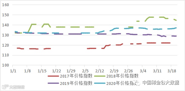 本周有五个交易日,稀土价格指数分别为136.0、136.1、136.3、136.5、137,自春节后受疫情影响,价格指数由复工后的131点,缓慢上升至137点。稀土价格指数年度走势及近四年同期价格走势见20190320-20200320区间稀土价格指数走势图、2017-2020年稀土价格指数同期走势图。