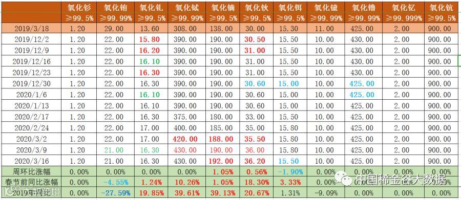 与2020年2月相比:氧化镧、氧化铈、氧化镨钕、金属镨钕价格下降,氧化钕、金属钕价格不变。