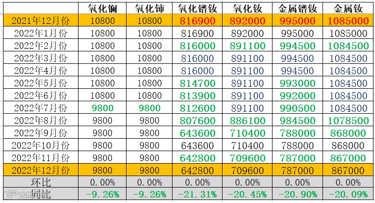 与2021年12月同期相比,氧化镧、氧化铈同比下降,降幅均为9.26%;镨钕系金属及其氧化物价格同比下降,氧化镨钕、氧化钕、金属镨钕、金属钕同比降幅分别为21.3%、20.5%、20.9%、20.1%。