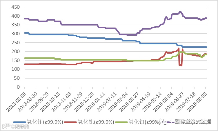 与2018年8月6日挂牌价同比分析:氧化钐、氧化钪同比价格不变;其它氧化物同比价格均有涨跌,其中同比价格变化超过20%的均为上涨, 有氧化钆(涨34%)、氧化铽(涨40%)、氧化镝(涨75%)、氧化铒(涨22%)。
