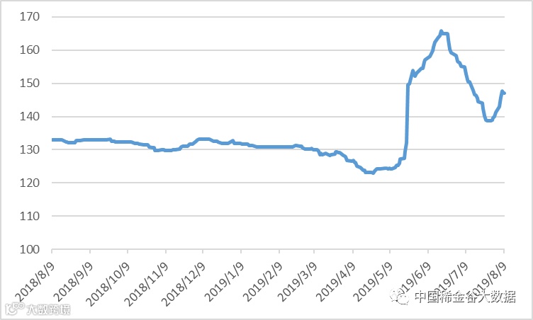 本周有五个交易日,稀土价格指数分别为143、145.7、147.6、147.3、147.1,本周稀土价格指数继上周继续上涨。7月29日降至最低点138.7后,指数连续两周回升。稀土价格指数年度走势及近四年同期价格走势见20180802-20190802区间稀土价格指数走势图及2016-2019年稀土价格指数同期走势图。