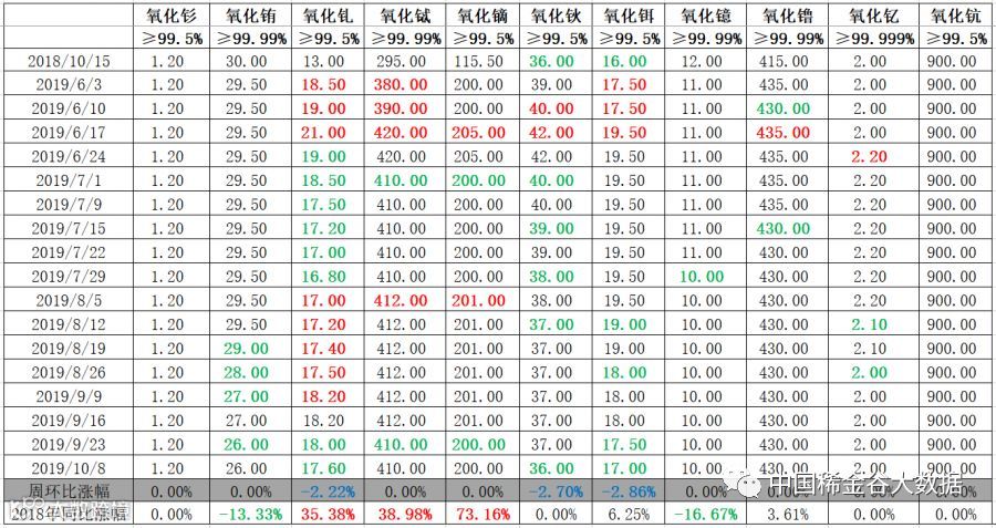 与2018年10月15日挂牌价同比分析:氧化钐、氧化钬、氧化钇、氧化钪同比价格不变;其它氧化物同比价格均有涨跌,其中同比价格变化超过20%的均为上涨,有氧化钆(涨35.38%)、氧化铽(涨38.98%)、氧化镝(涨73.16%),氧化钆上涨幅度比上期(38.46%)降低。