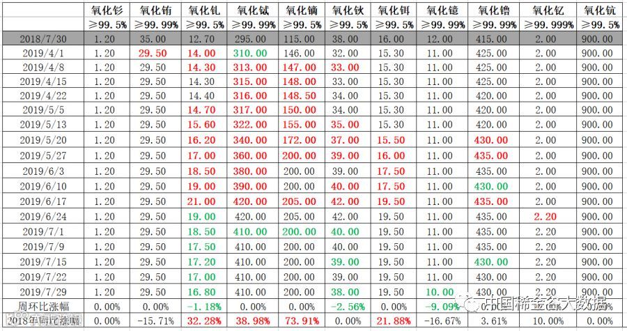 与2018年7月30日挂牌价同比分析:氧化钐、氧化钪同比价格不变;其它氧化物同比价格均有涨跌,其中同比价格变化超过20%的均为上涨, 有氧化钆(涨32%)、氧化铽(涨39%)、氧化镝(涨74%)、氧化铒(涨22%)。