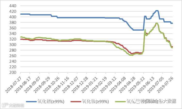 与上次发布(7月22日)相比,本周氧化钆、氧化钬、氧化镱价格向下微调,其它氧化物价格保持不变。