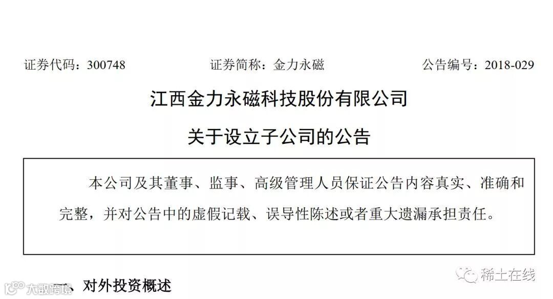 江西金力永磁科技股份有限公司为战略发展需要,以自有资金出资2,100万元,成立全资子公司金力永磁(宁波)投资有限公司,从事投资咨询(除证券、期货)、实业投资、投资管理业务。对外投资目的在于为便于对公司主业密切相关及磁性材料上下游相关产业项目进行投资,扩大公司业务规模,提升公司的盈利能力和核心竞争力。此次对外投资符合公司的战略需要,有利于增强公司的综合竞争实力,对公司未来的发展有着重要的积极作用。新设子公司成立后,短期内尚不能产生经济效益,对公司当前的财务状况和经营成果不存在重大影响。(来源:金力永磁)