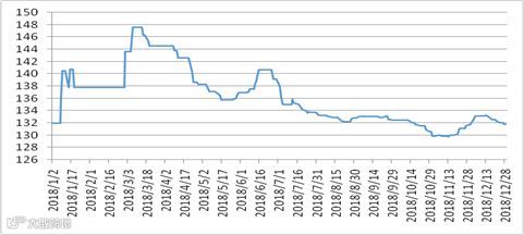 本周为2018年最后一个交易周,共有六个交易日,前三天指数为132,后三天指数为131.8,稀土指数经过月初的上扬后,逐渐阴跌。从整个2018年稀土指数走势图来看,无论是3-4月份指数上升,10月份后的阴跌至最低点,2018年最后一个交易日指数为131.8,2018年第一个交易日131.9,起起落落,终点又回到起点。2018年走势见201801-20181229区间稀土价格指数走势图。