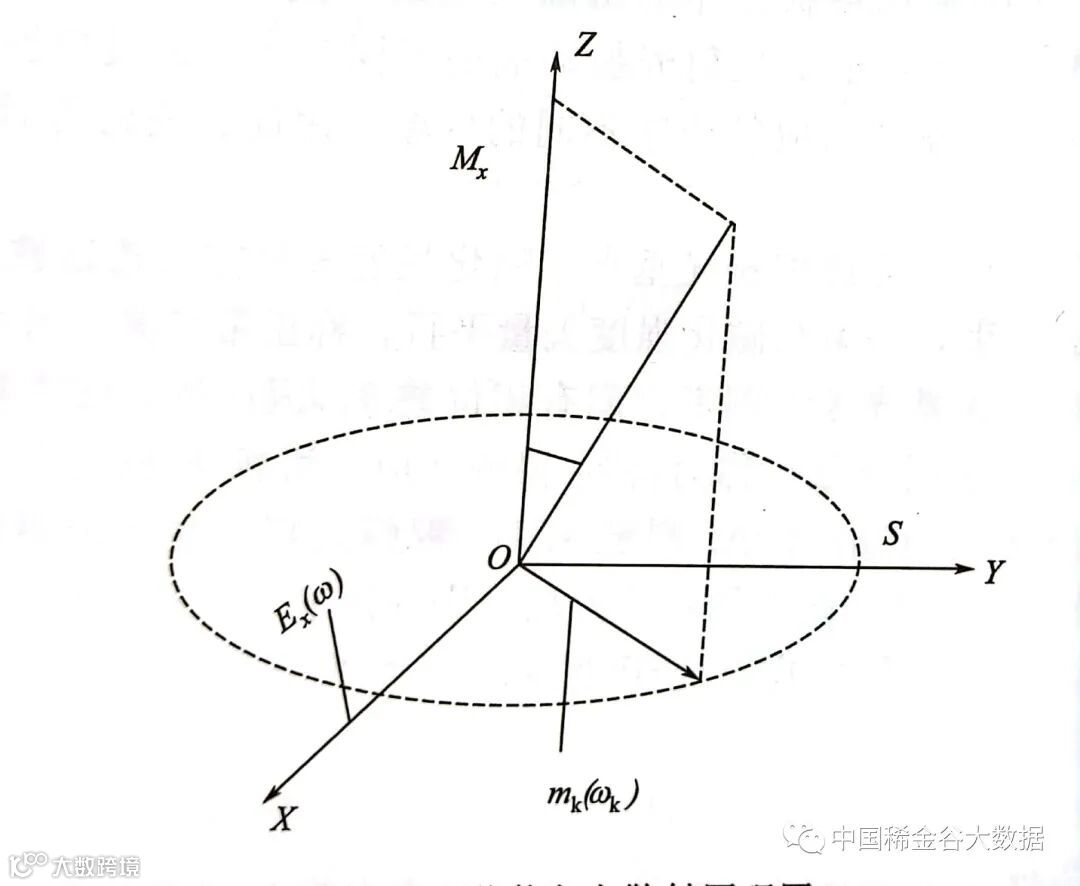 如图所示,Z轴方向施加一恒磁场,磁化强度Ms绕Z轴进动,Ms在OZ轴的分量Mz=常数,在YOZ平面里的旋转分量为mk(ωk),它是被激发出的以wk为本征进动频率的自旋波磁振子。当沿OY轴有光传播,则沿OX轴有电场强度分量Ex(ω)并与mk(ωk)发生相互用,结果是在OZ轴方向产生电极化强度分量Pz(ω±ωk)的辐射就构成一级拉曼散射,称为磁激发散射。