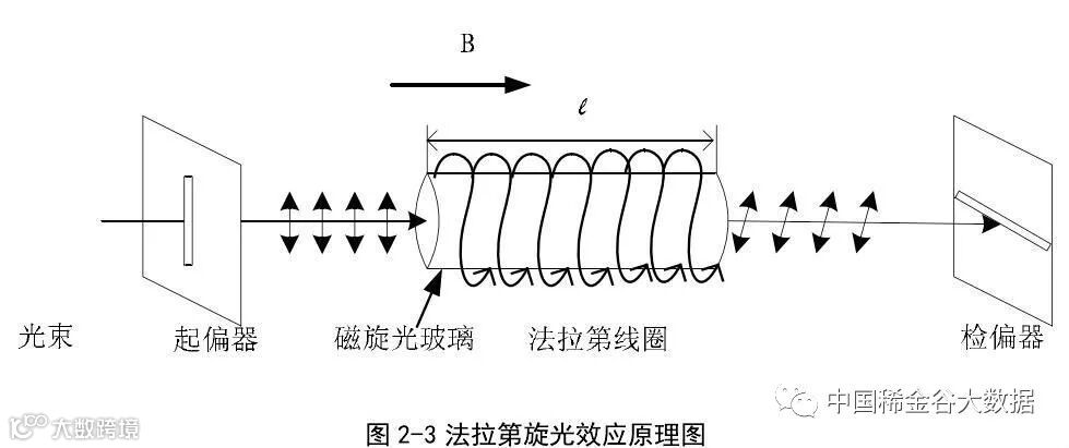 1845年法拉第发现玻璃在强磁场的作用下具有旋光性,加在玻璃棒上的磁场引起了平行于磁场方向传播的线偏振光偏振面的旋转。此现象被称为法拉第效应。法拉第效应第一次显示了光和电磁现象之间的联系,促进了对光本性的研究。费尔德(Verdet)通过对许多介质的磁致旋转进行了研究,发现法拉第效应在固体、液体和气体中都存在。大部分物质的法拉第效应很弱,掺稀土离子玻璃的费尔德常数稍大。近年来研究的钇铁石榴石等晶体的费尔德常数较大,从而大大提高了实用价值。