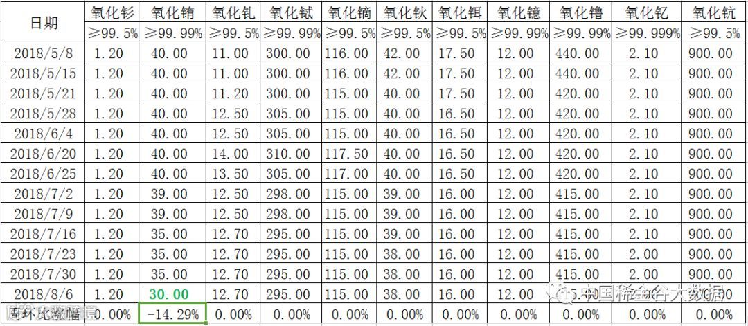 表一 中重稀土氧化物2018年5-8月挂牌价格 万元/吨
