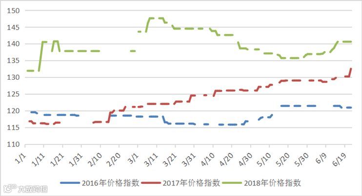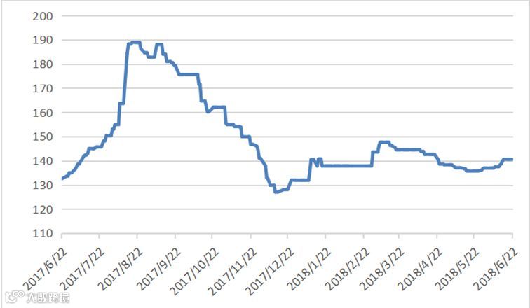 本周端午节,四个交易日稀土指数均为140.6,本周稀土价格指数在上周五基础之上,持平。稀土价格指数近一年走势见20170622-20180622区间稀土价格指数走势图。对比2016及2017年同期,价格指数同比上涨,见图2016-2018年稀土价格指数同期走势图。