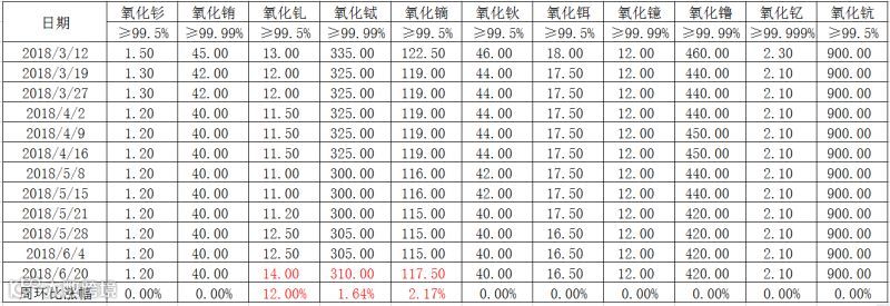 6月20日本周三南方稀土集团发布了本周中重稀土挂牌价格(见表一),与6月4日挂牌价格相比,氧化钆、氧化铽、氧化镝三种氧化物价格上涨,其它氧化物价格持平,具体价格变化为: