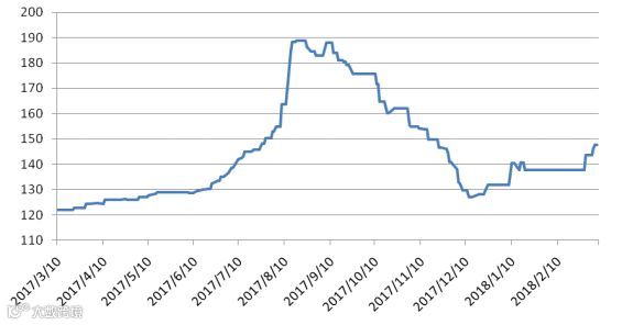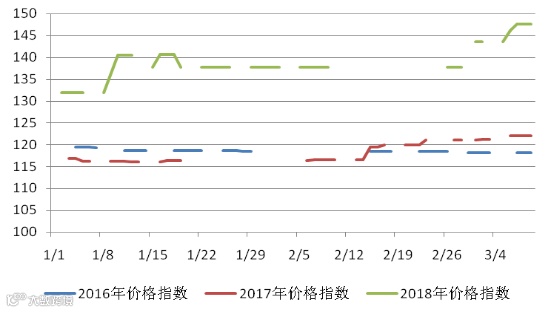 本周五天稀土价格指数分别为143.6、146.2、147.6、147.6、147.6,本周价格指数同上周相比有轻微上涨,随着节后各金属厂进入正常生产,生产原料需求量增大,预计价格仍平稳上涨。稀土价格指数近一年走势见20170310-20180309区间稀土价格指数走势图。对比2016及2017年同期,价格指数同比上涨,对比图见2016-2018年稀土价格指数同期走势图。