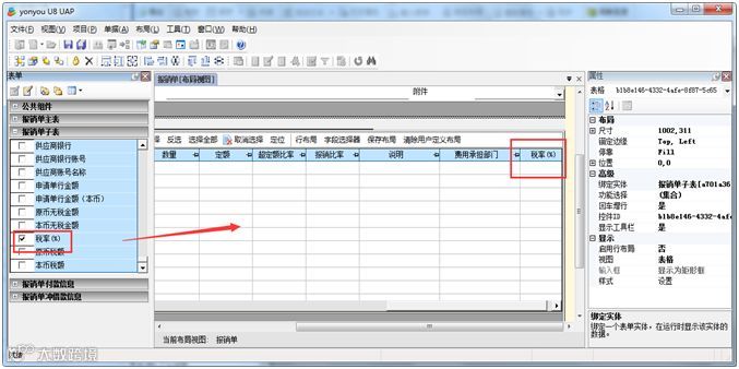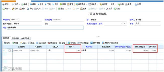 进入【基础设置】-【单据设置】-【单据格式设置】按钮,找到报销单模板,如“差旅费报销单”的显示模版,双击进入单据格式设置,点击“报销单子表”,勾选“税率”字段,显示出来;