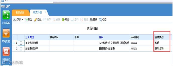 点击【网上报销】-【科目设置】-【收支科目】按钮,根据金额类型自动带出科目税金和无税金额