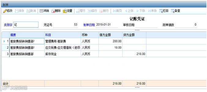 贷:库存现金 218元