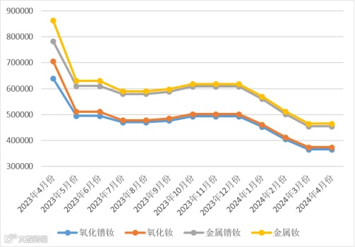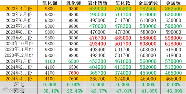 与2023年4月同期相比,氧化镧、氧化铈同比下降,降幅分别为58.16%、22.45%;镨钕系金属及其氧化物价格同比下降,氧化镨钕、氧化钕、金属镨钕、金属钕同比降幅分别为42.77%、47.01%、41.85%、46.09%。