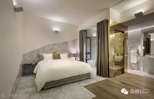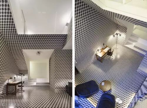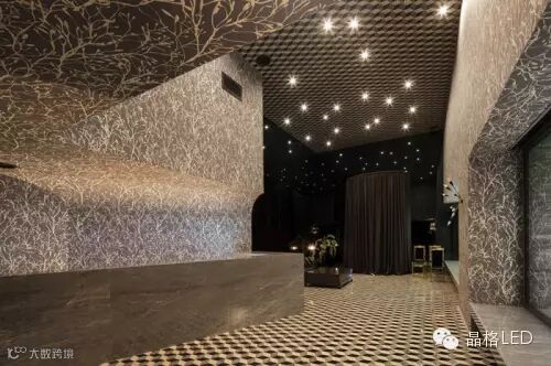 室内灯光设计照同时射着地板和天花板。当然,无论是地板还是天花都没有一面真正的镜子。黑色的不锈钢覆盖着整个弧形墙面并把自然而分散的灯光扭转成星光。