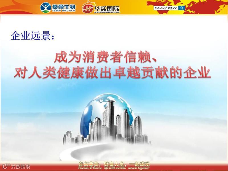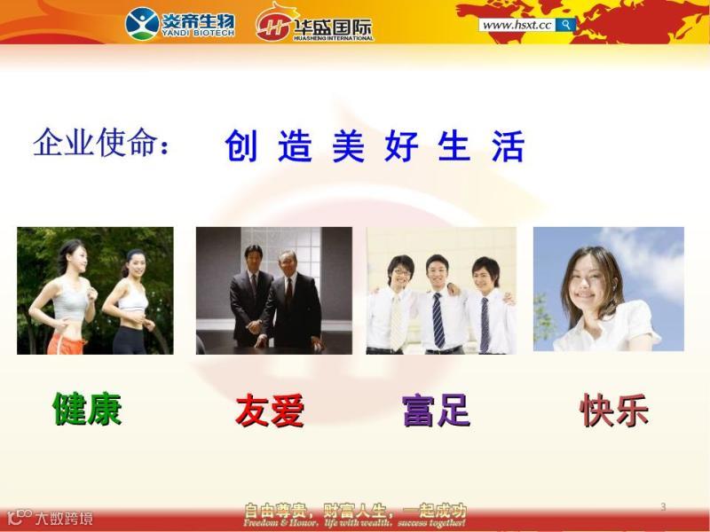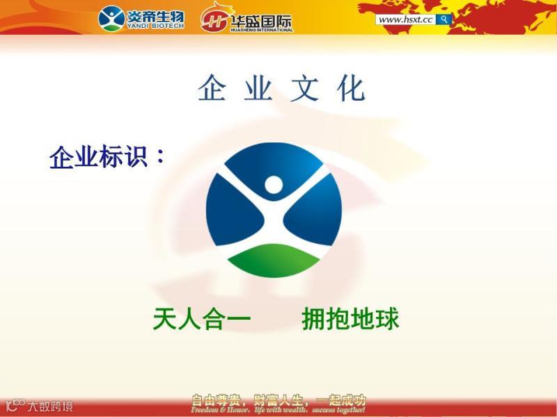 企业使命:创造美好生活,也就是创造健康、富足、友爱和快乐的生活。在炎帝公司倡导H型文化,H是hospitality热情周到;H也是host主人;在这里我们倡导每一个炎帝人都要以主人翁的心态热情周到的服务好我们的每一位新老会员。使用炎帝的产品,您将获得健康;分享炎帝的产品,您将获得友爱和富足;最后当您成功在握的时候,您将拥有无限的幸福快乐感。