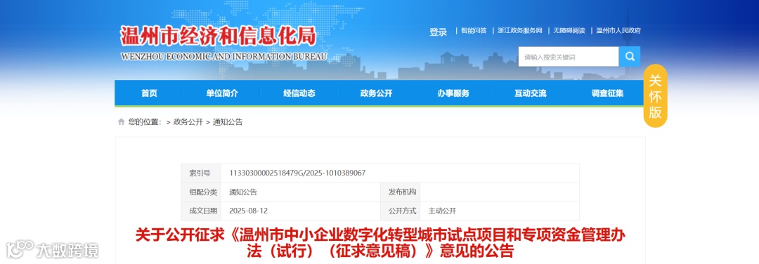 第一条 为深入贯彻落实党中央、国务院关于支持中小企业创新发展、加快中小企业数字化转型系列决策部署,规范和加强中小企业数字化转型城市试点专项资金管理,根据《财政部 工业和信息化部关于开展中小企业数字化转型城市试点工作的通知》(财建〔2023〕117号)、《财政部办公厅 工业和信息化部办公厅关于做好2025年中小企业数字化转型城市试点工作的通知》(财办建〔2025〕20号)、《温州市中小企业数字化转型城市试点工作方案》等文件要求,制定本办法。