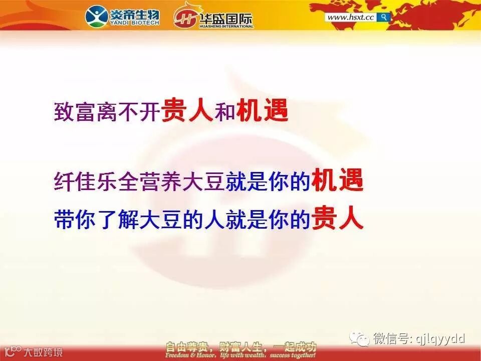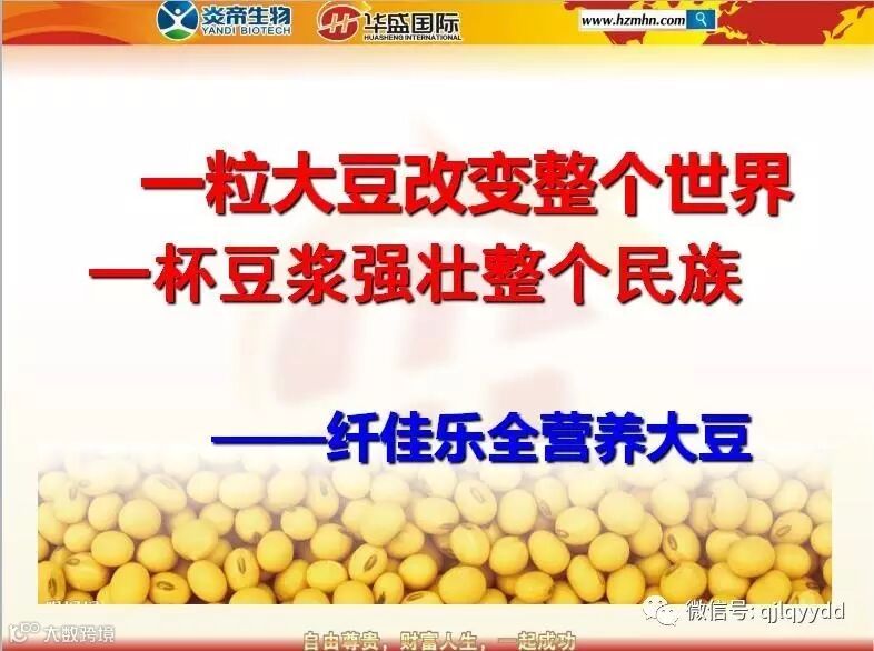 整个中华大地对食品安全一筹莫展之时, 被广大经销商美誉为华人第六大发明的“纤佳乐全营养大豆”已经震撼上市,鸡、鸭、鱼、肉、豆、蛋、奶、是全国销量最大的产品,但是动物类食品已经没有安全性可言了,唯独全营养大豆一枝独秀,被誉为绿色牛奶植物肉,因此它的出现将彻底改变中国人的饮食结构。
