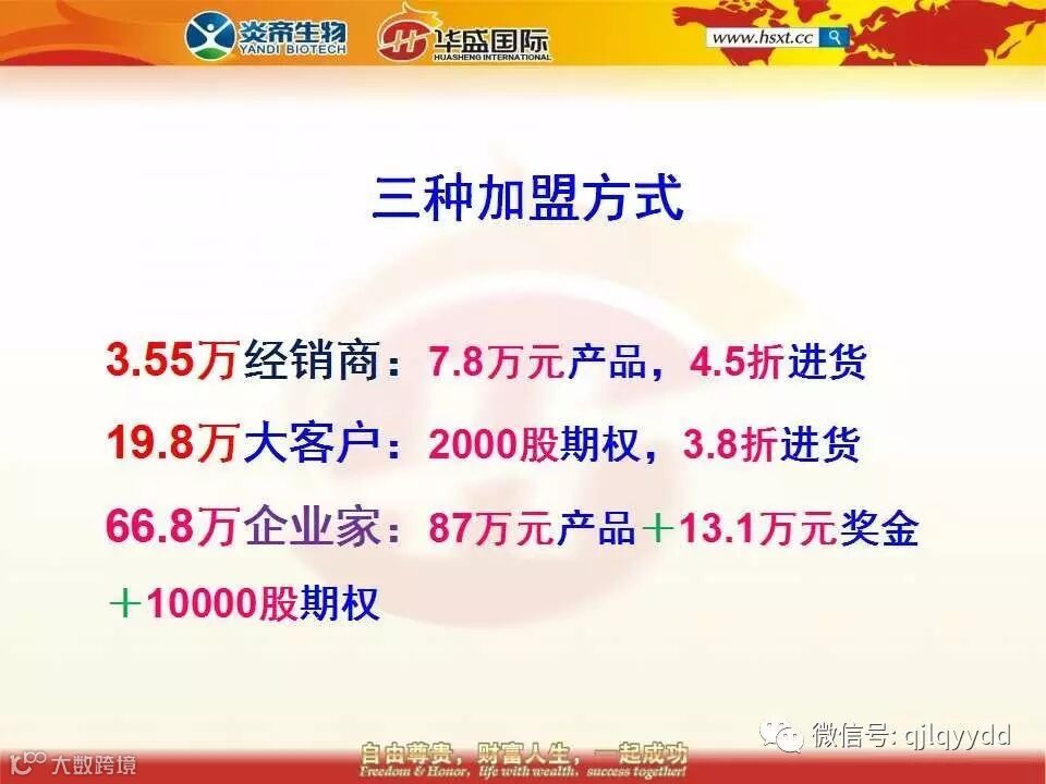 第二种方式,就是用传统的销售方式累计完成66.8万的销售额同样可以获得6000的分红期权。比如你开个早餐店卖豆浆,每杯成本1块钱你卖3块钱,每天卖个100杯也有200元的利润,累计达到66.8万照样可以获得6000的分红期权。再比如你在酒店里面卖豆浆,每扎成本5块钱你卖38元或者48元,累计达到66.8万也可以获得6000的分红期权。华之魅公司不会管你用什么方式来做销售,只看你的销售业绩达标了没有。