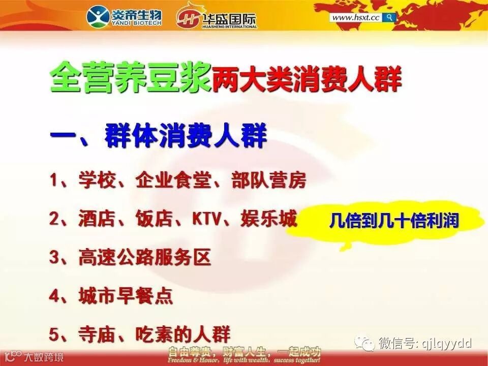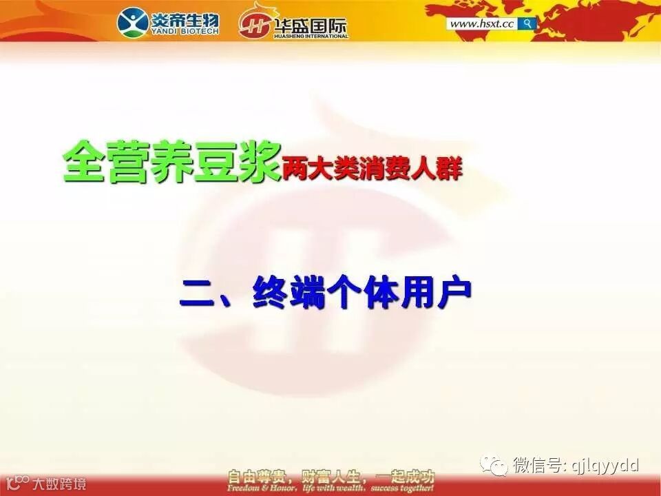 犹太人有句话讲得好:谁抓住了终端消费者谁就抓住了世界财富的分配权。我们抓的就是终端消费者,而且抓的还是人心。将来我们可以有发不完的分红期权,豆浆的期权发完了我们可以发豆油的期权,豆油的期权发完了我们可以发酒水饮料的期权,酒水饮料的期权发完了我们可以发茶叶的期权,总之我们做多少种产品我们就可以发多少种期权。
