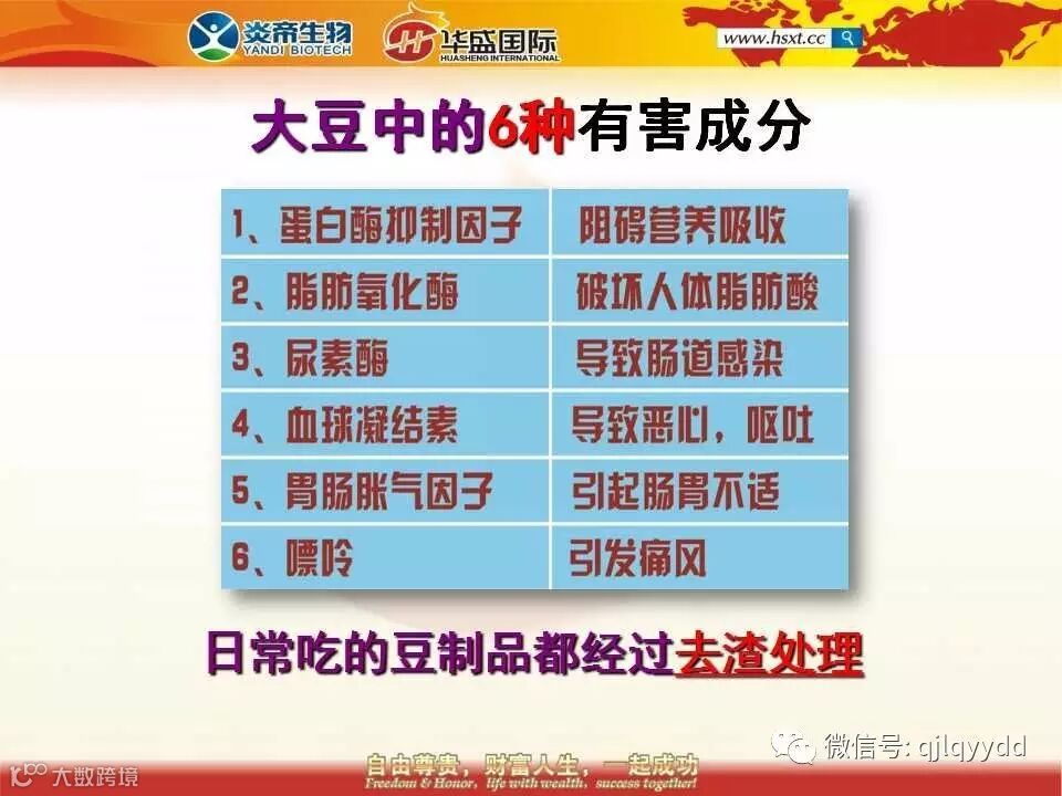7、为什么会出现这样的现象呢?大豆营养价值虽高,但里面含有6种对人体有害的成分,比如痛风的人就不敢喝豆浆,因为嘌呤含量高;有些人一喝豆浆就会腹胀、腹泻,因为大豆里面含有尿素酶和胃肠胀气因子等等。其实这6种对人体有害的成分恰恰是大豆的6种自我保护因子,地球上任何一个现存的物种都有其生存之道,仙人球长满刺来保护自己,乌龟有外壳来保护自己,大豆靠什么?就靠这6种自我保护因子。所以古往今来人类食用豆制品全部都是去渣的,比如豆腐、豆干、豆皮、豆浆等等。