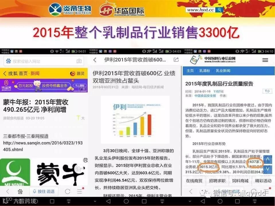 这是我们从网站上下载的关于乳制品行业的一篇专题报道。2015年,我们国家整个乳制品行业上规模的企业有637家,这637家乳制品企业全年的销售额是3300多个亿,这里还不包括更多不上规模的企业在内。其中蒙牛和伊利两家龙头企业就贡献了1100多个亿。