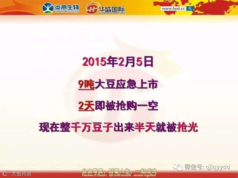 现在有很多公司打股权的概念来忽悠人,上当受骗的人很多,为什么呢?因为产品消耗太少根本就没钱分给大家。要知道,不是所有叫马云的人都富有的,同样不是所有的股权都是有价值的,凡是没有大量产品消耗做根基的股权都是忽悠。我们的纤佳乐豆浆是实实在在接地气的产品,一经推出就供不应求,并且还在呈几何级的增长,未来的分红将远远超过现在不知多少倍,所以我们的分红期权才是真正超值的东西。