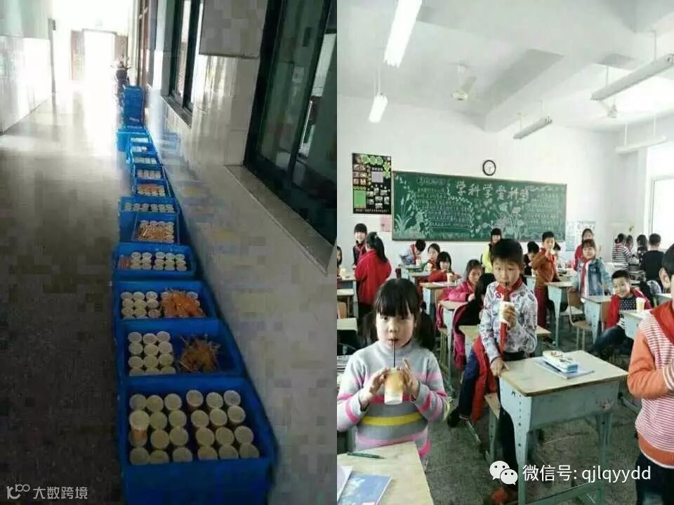 14、一箱箱全营养豆浆整整齐齐地排列在教室的门外,课间休息的时候这些小朋友们人手一杯,喝得不亦乐乎。