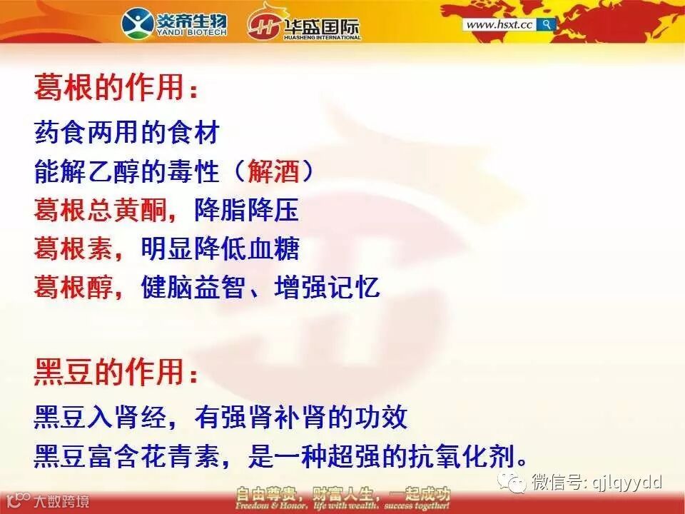 24、用黑豆、燕麦、玉米、天贝结合葛根一起打豆浆,我们称之为天贝葛根黑豆浆。为什么要用葛根和黑豆呢?葛根既是一种食物可以直接食用,同时也是一种宝贵的中药材。葛根能解乙醇的毒性,药店里面卖的解酒药十有八九都是用葛根制作出来的。葛根里面的葛根总黄酮有降脂降压的功效,葛根素能明显降低血糖,葛根醇有健脑益智的功效,能增强记忆。使用黑豆是因为黑豆能入肾经,有强肾补肾的功效,并且黑豆富含花青素,是一种超强的抗氧化剂,其抗氧化的效果是维生素C的20倍、维生素E的50倍。天贝葛根黑豆浆对四高人群的康复帮助非常之大,效果非常显著,这两年来我们用无数的事实验证了世界卫生组织对纳豆激酶所作的结论是正确的。