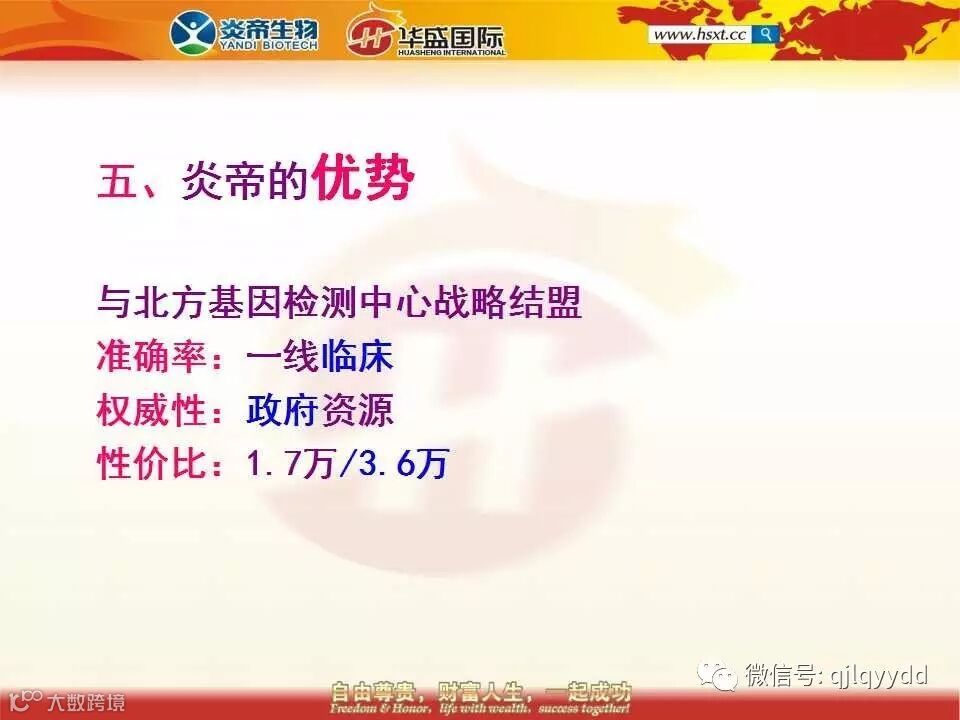 以往政府把基因检测都是放在三甲医院里面推广的,现在炎帝公司也可以推广了。你到任何一家三甲做68项基因检测的话,至少得花5到6万元。今天在炎帝公司做68项基因检测仅仅只需1.7万元,这是我们的价格优势。