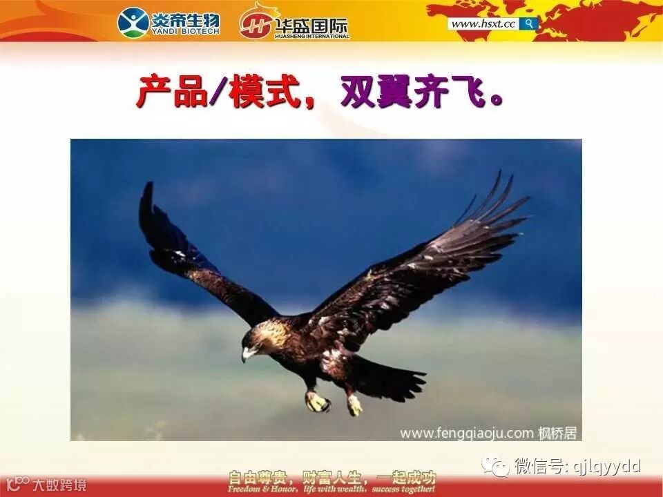42、刚才跟大家分享了两款战略级的好产品,最后再跟大家介绍一下我们的营销模式。好产品+好模式它就好比老鹰的两个翅膀,缺了任何一个都飞不起来。